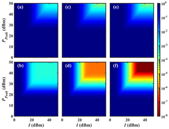 The comparison between (a), (c), and (e) with (b), (d), and (f) in Figure 5 reveals that User2 outperforms User1 due to the difference in channel gains. Moreover, by comparing the three columns (a) (b), (c) (d), and (e) (f), it is evident that the link performance increases with the increase in . Finally, we observe that a single change in either or I does not significantly enhance the link performance. Only when both parameters are increased simultaneously is the link performance improved. Thus, the performance advantage is concentrated in the rectangular region in the upper right corner of the figure.