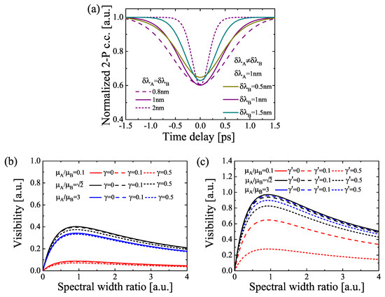 To facilitate a deeper understanding of our model, we give a numerical calculation based on real experimental parameters. Here, pulse trains with a time duration of ps or fs at a central wavelength of 800 nm are considered. In this case, the linewidth , where c is the speed of light and is the central wavelength), with a value range of several nm, can be realized using an optical interference filter. Figure 3 gives the interference results between two weak coherent states. The normalized two-photon coincidence is plotted in Figure 3a as a function of relative delay for different linewidth when the two weak coherent states have the same average photon number with Equation (32). The observed maximum visibility (at ) is 0.5 when the two input states have the same spectral width, indicating that it is independent of the absolute spectral width. However, the FWHM of the HOM dip for a broad spectral width is less than that of the narrower spectral width. The interference visibilities, as a function of the spectral width ratio of to , are shown in Figure 3b,c using Equations (33) and (41). Obviously, the interference visibility has a different degree of reduction due to the system noise. By isolating the coincidence of a two-photon state in a coherent state, a visibility of more than 0.5 will be observed, as shown by the solid curve in Figure 3c (red solid curve, black solid and blue solid curves are overlapped). For the case of the same average photon number, the maximum interference visibility occurs on the condition of two weak coherent states with the same spectral width. Otherwise, the system needs to be optimized by considering some practical experimental parameters, such as mismatches in the intensities, the states of polarization of the input signals, and the overall intensity of the input signals. It is also worth mentioning that the unequal average photon number will decrease the two-photon interference visibility.