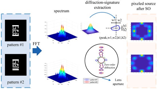 Given the location of the diffraction orders in the mask spectrum, the approximate source distribution for SMO can be estimated []. Therefore, when multiple mask patterns are used for SMO, patterns with similar spectra, particularly those with similar diffraction order positions, contain redundant information. In other words, only parts of all the patterns that include all the diffraction information are required in the SMO process. Based on this principle, different patterns with close diffraction order positions that conform to the coverage relationship can be clustered together. Figure 2 illustrates the process of determining whether two patterns belong to the same group using the diffraction signature method. Patterns 1 and 2 were different patterns from the same group in the dataset. After applying the Fourier transform, the spectra of the two patterns were calculated. Subsequently, the zero orders, as well as the strongest and middle orders, were removed. Then, the other orders were extracted as the form of the diffraction signature from the spectra without considering their harmonics. Every diffraction signature includes five features . Therefore, the two patterns’ signatures were used to check whether one’s orders were all covered by another pattern’s. If the above statement was true, as shown in Figure 2, they were labeled as the same group. In Figure 2, the source optimization (SO) results are close and verify this conclusion.