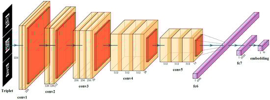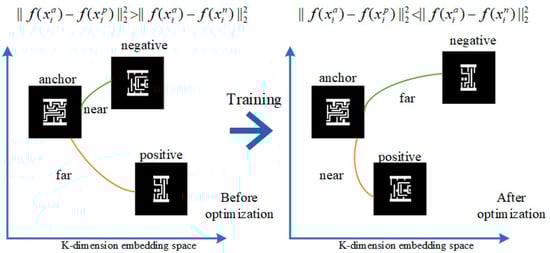 To optimize the CNN model, triplet loss was introduced as the loss function during the training process. This loss ensured that (anchor) of a triplet was closer to (positive) than to (negative). The designed optimization goal of triplet loss is to make embeddings satisfy the inequality shown in Figure 4. This can also be written as follows: