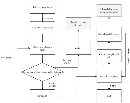 The detailed workflow is shown in Figure 6. The set of pattern embeddings was stored and clustered after the pattern images were mapped onto the feature space. An embedding point can be individually classified as a core point or an outlier until all points are checked, mentioned in Figure 6. All core points were stored, and the outliers were classified into a single group. Considering the pattern selection situation, ε is a margin of in triplet loss. For each core point, the reachable points were determined individually. Once mutually reachable, they were classified into the same group and deleted from the core point set. If no members remained in the set, the algorithm was terminated. Subsequently, every group had a centroid in the K-dimensional space, and the critical pattern in each cluster could be determined by Equation (5).
