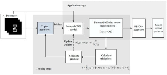 The pattern selection workflow was composed of several substeps after cutting patterns from the full-chip area: pattern transformation, pattern clustering, and critical member selection. This study introduced a CNN in the pattern transformation part and output the CNN embedding to cluster and select critical patterns in later processes. A CNN with updatable parameters can perform nonlinear mapping; thus, it can be trained to obtain the most appropriate mapping relationship from pattern graphics into the abstract space in SMO. The workflow of the proposed critical pattern selection process shown in Figure 7 can be divided into two stages: training and application. Before patterns were fed into the CNN model in the training stage, triplets were generated first through the strategy mentioned in Section 2.3. Then, respective embeddings and their losses after forwarding CNN could be calculated. With the triplet loss, the model could be updated by SGD. The trained model could be applied to achieve the transformation from pattern images to embedding vectors. The DBSCAN algorithm clustered the embeddings and determined the critical members in each cluster based on the distribution of embeddings.