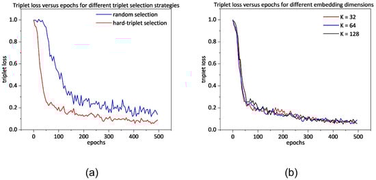 The model was pre-trained through the traditional cross-entropy loss in 100 epochs, followed by the triplet loss in 500 epochs, instead of using the direct triplet loss. The pretraining stage helps the formal training stage converge more quickly. The learning rate η in Equation (4) is for the pre-training stage and for the formal training stage. The optimization process in the formal stage with different triplet selection strategies is shown in Figure 8. In Figure 8a, the hard triplet selection curves converged much more quickly, and their loss could drop to a lower position compared to the random-selection curve. This proves that the hard triplet selection strategy improved optimization performance. As shown in Figure 8b, for different K values, the trends of all three curves were similar, and they all converged in approximately 300 epochs. The final triplet loss was close to zero, implying that the model converged well in the dataset.