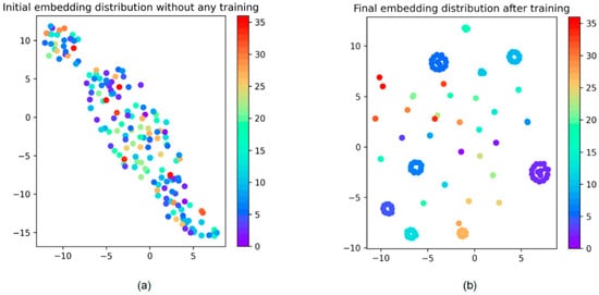 Embedding distribution of the training data (a) without training and (b) after training in 500 epochs. The X- and Y-axis are the two projected axes after PCA.
