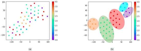 Figure 9 shows the changes in the distribution embedding output from the initial to the final model. The point in the coordinates is embedded from the CNN, and the different colors indicate its group. Because high-dimensional information is difficult to visualize, methods such as principal component analysis (PCA), a dimension reduction method, were applied for visualization. The distribution after projection does not show the exact situation and only contains general information. In Figure 8a, the embedding distribution was chaotic, and patterns from different clusters mixed without any rules. The distribution after optimizing the model was much better, as shown in Figure 9b. Almost all patterns belonging to the same group were held together, and different groups had margins between each other, even though some points did not obey these rules. This indicates a small in-group distance and a large between-group distance.