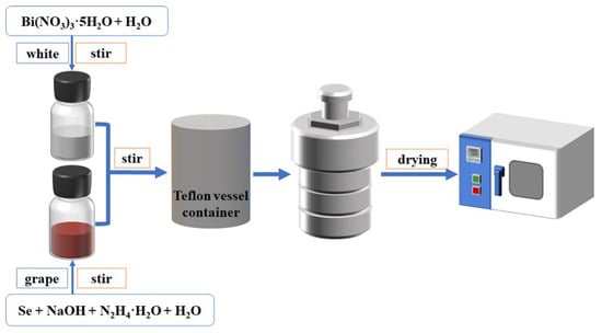 The Bi2O2Se nanosheets were synthesized using a hydrothermal method. First, 2 mmol of Bi(NO3)3·5H2O was dissolved in 10 mL of deionized water in beaker A and stirred for 0.5 h. Then, 220 μL of N2H4·H2O, 600 mg of NaOH, and 10 mL of deionized water were mixed in beaker B and stirred to form a saturated alkaline solution. Then, 1 mmol of Se powder was put into beaker B with ultrasonic treatment until the solution became a transparent orange color. Then, the solutions in beaker A and beaker B were poured into a 50 mL Teflon vessel container and stirred for another 15 min. Then, the Teflon vessel was sealed in a stainless-steel autoclave and placed in a furnace at a temperature of 80 °C for 6 h. After the reaction was completed and the instrument naturally cooled down to room temperature, the product was washed several times with deionized water and ethanol via centrifugation, and the Bi2O2Se nanoparticles were obtained. The schematic diagram of the preparation process is shown in Figure 1.