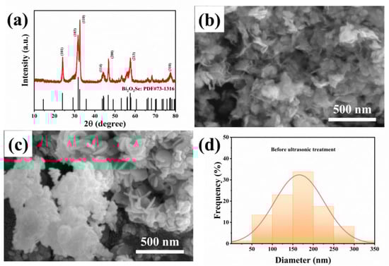 Figure 2a shows the XRD pattern of the Bi2O2Se nanopowders. Two peaks, at 31.8° and 32.5°, can be observed, which are related to the preferred orientation on the (103) and (110) planes, respectively. Further, other peaks, at 23.9°, 43.7°, 46.6°, 53.1°, 56.2°, 57.9°, 68.1°, and 77.4°, correspond to the (101), (114), (200), (116), (213), (109), (208), and (310) planes of the tetragonal Bi2O2Se (JCPDS No. 73-1316), respectively. The lattice constants are a = 3.891 Å, b = 3.891 Å, and c = 12.213 Å, and the grain size is about 9 nm, which was calculated using the Scherrer equation [18,21,22,25,37]. No obvious impurity peak could be found in the XRD pattern, implying that the obtained sample is Bi2O2Se, and that it has distinguished crystallinity. Figure 2b and c show the SEM images of the obtained Bi2O2Se. It can be observed that the Bi2O2Se nanoparticles are composed of many tiny nanosheets. [18,22] After statistical analysis, the average size of the nanosheets was about 180 nm, as shown in Figure 2d.