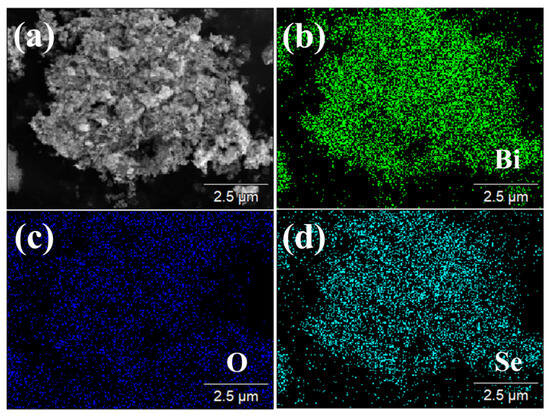 Figure 3 shows low-resolution SEM images of Bi2O2Se nanosheets, with the corresponding EDS elemental mapping of Bi, O, and Se. As illustrated in Figure 3b–d, the distribution of elements Bi, O, and Se is uniform, and the shape is consistent with the SEM image [5,14,25]. The corresponding elemental analysis data are shown in Figure S1 and Table S1 (as seen in Supplementary Materials). It was found that the element ratio between Bi and Se is about 2:1. The oxygen content of the samples was difficult to accurately measure due to the influence of the adsorbed CO2, H2O, O2, and organics.