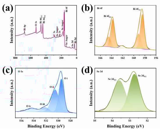 Figure 4a displays the survey XPS of the Bi2O2Se nanosheets. The Bi, O, and Se signal can be observed clearly. Figure 3b–d show the fine spectra of elements Bi, O, and Se. In Figure 4b, Bi 4f7/2 and Bi 4f5/2 peaks, located at 158.4 and 163.7 eV, can be found, which are related to the Bi–Se bond [5]. The two higher peaks, at 159.1 and 164.5 eV, correspond to the Bi–O bond [23,25]. The O 1s spectrum (Figure 4c) comprises four peaks (529.5, 530.5, 532.2, and 534.3 eV) [20,23]. The peaks at 529.5 and 530.5 eV correlate to the Bi–O bond in the lattice and on the surface [25]. The peak at 532.2 eV corresponds to the signal of oxygen vacancies [13]. The peak at 534.3 eV may be caused by the adsorbed organics on the surface of the sample [21,38,39]. Based on the Se 3d spectra in Figure 4d, the two fitted Lorenz peaks at 52.7 and 53.6 eV are within the plausible chemical shift range of the Se 3d core level of Bi2O2Se, and correspond to Se 3d5/2 and Se 3d3/2, respectively [23,25].