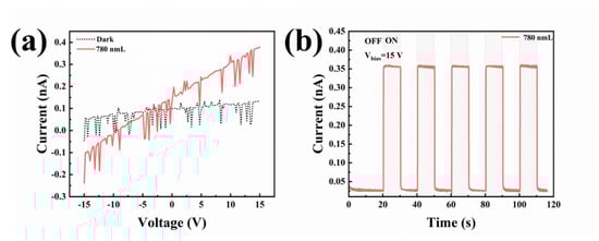 The obtained Bi2O2Se nanosheets were used to construct a photoconductive-type photodetector, which was composed of the Bi2O2Se film and two silver pastes. The I-−V curve and I-−t curve were tested using a two-probe system on the probe station, with a Keysight B2901A source meter as an external power supply. The I-−V curve is shown in Figure 5a. The dark current of the Bi2O2Se film photodetector is less than 0.1 nA when the bias is 15 V. Under 780 nm infrared light illumination, its photocurrent can reach 0.35 nA, demonstrating a significant infrared-light response property. In addition, from the I-−t curve shown in Figure 5b, it can be observed that the light-response characteristics are relatively stable and reproducible at 15 V bias. The stable dark current was about 0.025 nA and the photocurrent was 0.35 nA. The on/off ratio was about 10. The response speed of the obtained photodetector was also very fast.