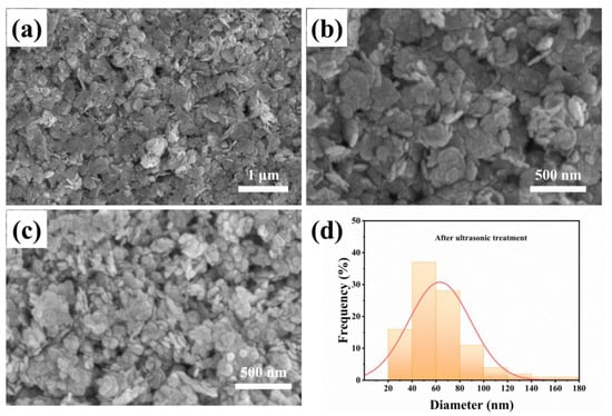 (a–c) SEM images of the Bi2O2Se nanosheets after ultrasonic crushing treatment, and (d) the columnar statistical chart of the nanosheet sizes corresponding to (c).