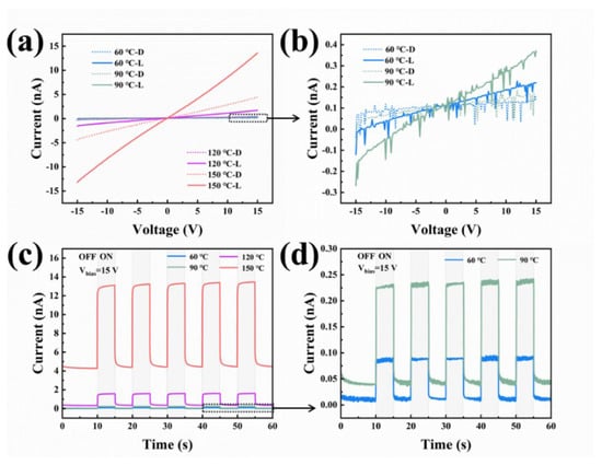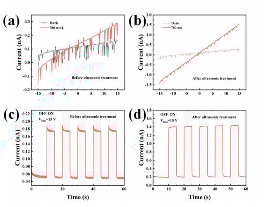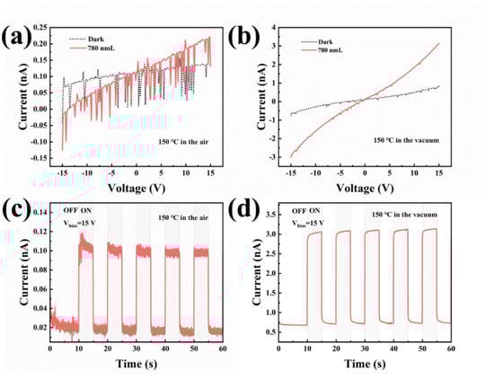 Besides the size of the nanosheets, the drying condition also affects the density of the film. Subsequently, the film was dried in the air and in a vacuum at 150 °C, respectively. Figure 9 shows the comparison of the photodetectors based on Bi2O2Se film when dried at 150 °C in the air and in a vacuum, respectively. Figure 9a,c show the I-−V curve and I-−t curve of the device dried in air, respectively. It can be observed that its photocurrent is slightly higher than the dark current at different biases. At 15 V bias, the stable dark current is about 0.02 nA, while the stable photocurrent is about 0.10 nA, with an on/off ratio of 5. Compared to the device dried in the air, the device dried in a vacuum exhibits superior photodetection performance. Figure 9b,d show the I-−V curve and I-−t curve of the photodetector dried in a vacuum. The photocurrent of this device is obviously larger than the dark current at the same bias (shown in Figure 9b). The stable dark current at 15 V bias is about 0.75 nA, and the photocurrent is about 3.0 nA. Both the dark current and photocurrent are improved, which was caused by an increase in the density of the film. The on/off ratio is about 4. Although the on/off ratio decreases, the photocurrent has increased by nearly 30 times. For comparison, the devices based on the Bi2O2Se film that were dried at 60 °C in the air and in a vacuum were also prepared and tested. The results are shown in Figure S2 (as seen in Supplementary Materials). The I-−V curves of these devices are very similar. The stable dark currents for the device dried in the air and in a vacuum are 0.07 and 0.02 nA, respectively. The corresponding photocurrents are 0.23 and 0.16 nA, respectively.
