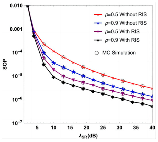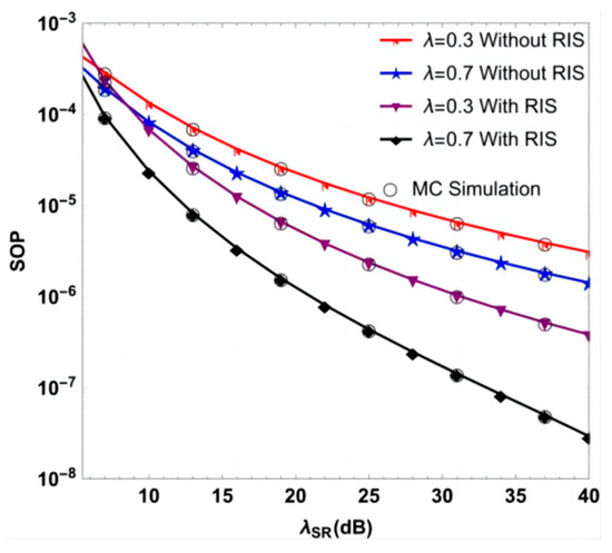 Figure 2 shows the correlation between the RF link instantaneous SNR and SOP under the influence of different time-switching factors with or without the RIS assistance. The results show that the system SOP decreases as increases. The value of SOP when is lower than that when , irrespective of whether the RIS is introduced or not. This is because as the time switching factor increases, the energy storage time becomes longer and the jamming effect of the transmitted jamming signal is better. Consequently, the system SOP was reduced significantly. Next, keeping the time switching factor of the system fixed and , RIS is introduced in the mixed system and compared with the SOP of the system before its introduction. The SOP values before and after the introduction of RIS are about 5.02 × 10−6 and 7.24 × 10−7, respectively. They differ by an order of magnitude, indicating that incorporating RIS can decrease SOP to improve security performance. Similarly, when , the SOP values before and after the introduction of RIS are about 2.38 × 10−6 and 8.45 × 10−8, respectively. Thus, they differ by two orders of magnitude. Therefore, as increases, the addition of RIS noticeably enhances the mixed system secrecy performance.