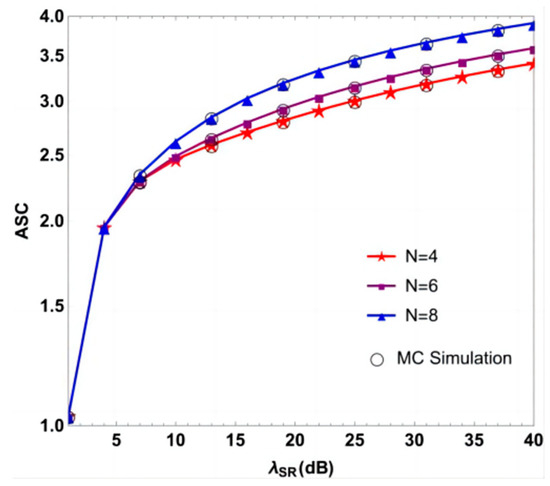 Figure 8 shows the correlation between and the RIS-aided mixed RF/FSO system ASC with the effect of a varying number of RIS-reflecting elements. As the simulation diagram shows, as increases, there is a corresponding increase in ASC. When , the ASC values are about 3.26, 3.44, and 3.75 for 4, 6, and 8 reflecting elements, respectively. The results show that the ASC is maximum at N = 8. This is because the RIS can reflect more interference signals with the increase of N that can greatly limit the receiver side rate of the eavesdropper, consequently increasing the ASC. Therefore, in the RIS-aided mixed RF/FSO system, an appropriate increase in N can effectively increase the ASC of the entire communication system.