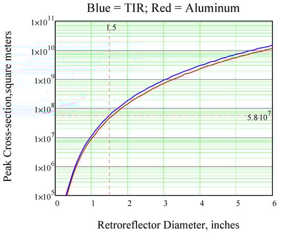 The peak cross-section in square meters as a function of the solid retroreflector diameter in inches for both Total Internal Reflection (blue curve) and aluminum back-coating (red curve) surfaces. The peak optical cross-section rises rapidly as the retroreflector diameter to the fourth power. For the popular 1.5 in (38 mm)-diameter cube with a physical cross-section of 0.001 m2, the peak optical cross-section is about 5.8 × 107 m2, an increase of over ten orders of magnitude.