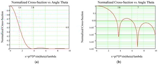 The FFDP of an unspoiled circular aperture retroreflector is plotted on a linear scale and a logarithmic scale in parts (a,b) of the figure, respectively. The half-power and first null occur at x = 1.6 and 3.8, respectively. For the popular 1.5 in (38 mm)-diameter cube at 532 nm, this corresponds to θ = 7.1 and 16.9 microradians (1.5 and 3.5 arcsec), respectively.