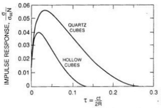 Impulse response in the large spherical satellite limit (Rs >> nL) for both hollow and solid quartz cube corners. The difference is due to the smaller acceptance angle in hollow cubes resulting in fewer cubes contributing to the return.