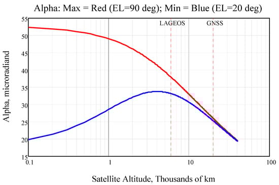 where v = the satellite velocity at an altitude hs above sea level, RE = the Earth’s radius = 6378 km, g = the surface gravity acceleration = 9.8 m/s2, c = the velocity of light = 3 × 108 m/s, θzen = the largest satellite zenith angle for tracking = 70°, = the unit vector to the satellite from the geocenter, = the unit vector from the station to the satellite, and = unit vector in the direction of the satellite velocity. The maximum and minimum values of the parameter α are plotted in Figure 8 as a function of the satellite altitude above sea level, hs.