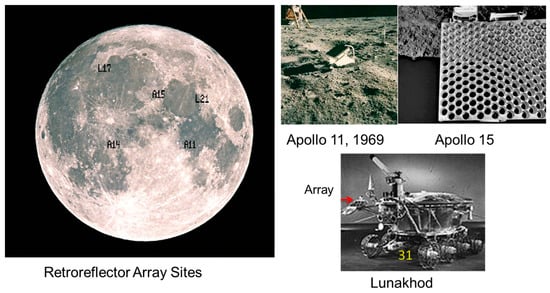 The earliest lunar-range measurements were conducted in 1962 by MIT Lincoln Laboratories by reflecting high-energy laser pulses (50 Joules) off the lunar surface and recording the received photons []. Subsequently, in 1969, in order to reduce the ground station telescope and laser energy requirements and simultaneously improve range accuracy to a specific lunar location, an array of one hundred 38 mm-diameter retroreflectors was placed on the lunar surface by the manned NASA Apollo 11 mission. In subsequent years, two other manned Apollo missions (14 and 15) also placed retroreflector panels on the Moon. Of these, the Apollo 15 array was the largest (300 vs. 100 cubes), thereby increasing the effective array cross-section (and return signal strength) by a factor of three relative to the earlier Apollo 11 and 14 arrays. Two unmanned Soviet Lunakhod (17 and 21) missions also landed arrays provided by France. Images of the current arrays and their locations on the lunar surface are provided in Figure 11.