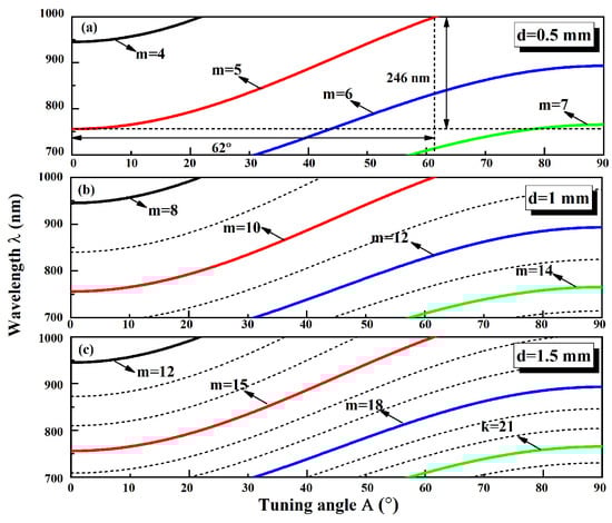 First of all, we investigate the tuning curves of on-axis BRF (). According to Equations (2), (4), and (6), we notice that the tuning curve of BRF is mainly associated with tuning angle A, BRF thickness d, and Brewster Angle . For the quartz BRF, the Brewster Angle is 57.2, and Figure 2 shows the tuning curves of quartz BRF with different thickness d. Here, we only display the wavelength range of 700–1000 nm, which corresponds to the fluorescence range of Ti:sapphire crystal. In the plotted region of Figure 2a, the tuning curve of k = 5 has the broadest wavelength range of 246 nm, the BRF needs to be rotated by 62 to achieve the maximal tuning range without considering the mode-hopping between different interference orders, and the corresponding TR is about 4.0 nm/, which is the same to that of Figure 2b,c. Further, by comparing the tuning curves of BRFs with different thicknesses of 0.5 mm, 1 mm, and 1.5 mm, it is also found that fewer wavelengths can lase depending on the value of A in the plotted range of 700–1000 nm for the thinnest plate, whereas for the thickest plate, lots of wavelengths can lase owing to the dense interference orders. The spacing of the curves represents the FSR of the BRF, so it is found that the FSR is inversely proportional to the thickness of the plate.