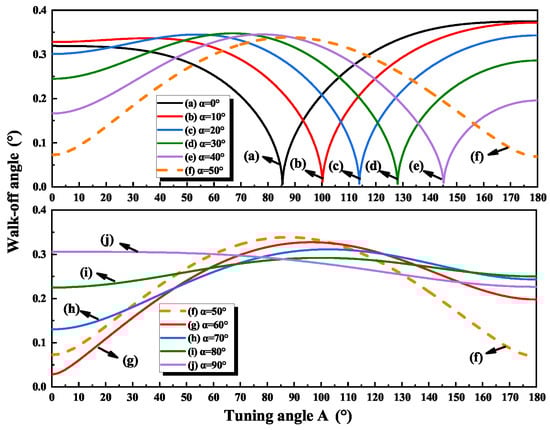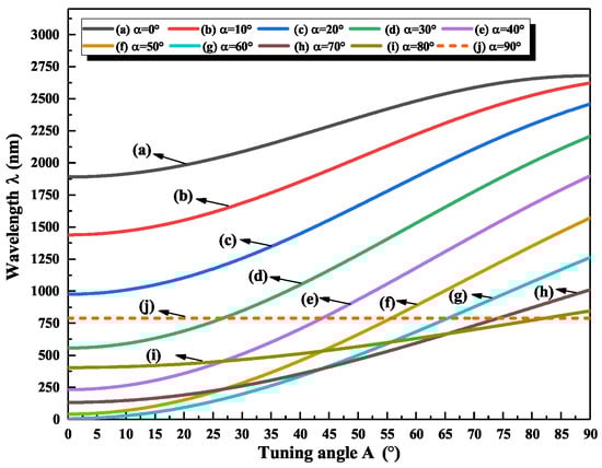 Then, the tuning characteristics of the off-axis BRF with different are investigated, which are more complex than that of on-axis BRF. Firstly, according to Equations (1), (3), and (6), the tuning curves of the 0.5 mm BRFs with different diving angles are plotted, which are shown in Figure 3. In order for ease of comparison, the tuning curves of BRF with different diving angles (0∼90) at the same interference orders () are drawn in this figure. Owing to the relationships between the wavelength and tuning angle A being nonlinear, we approximately calculate the TR at different . The TR increases from 8.9 nm/ to 18.5 nm/ when varies from 0 to 40, which is much larger than that of on-axis BRF shown in Figure 2. Just as K. Naganuma claimed, for a specific wavelength region, using the BRF with a steeply diving optic axis, the bandwidth can be changed by a factor of four [69]. When the continuously increases, the TR decreases, and is down to zero when = 90. Meanwhile, we noticed that the tuning slope efficiency achieves the maximum when the diving angle is near 30.