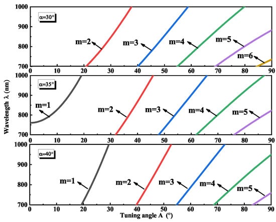 Additionally, considering the mode competition, the overlap of tuning curves among different interference orders is undesired, which will be greatly beneficial for smooth wavelength tuning. Therefore, the tuning curves of different interference orders have to be considered. Figure 4 specifically shows the tuning curves of the BRF with diving angles of 30, 35, and 40 when the interference order m is 1, 2, 3, 4, 5, the plotted wavelength range is also 700 nm–1000 nm, which corresponds to the fluorescence range of Ti:sapphire crystal. It is found that the tuning curves of each interference orders have the minimal overlap when = 40, which can give us an important reference for the choice of .