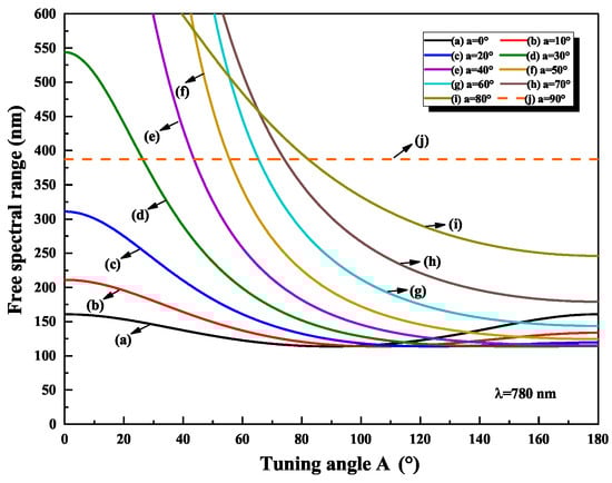 In order to demonstrate the tuning characteristics of off-axis BRF more intuitively, the FSR at different diving angle when the operating wavelength is 780 nm, which when corresponding to the highest gain of the Ti:sapphire crystal, are firstly calculated according to Equation (7). The results are shown in Figure 5. It is seen that the larger is, the larger FSR is at the same tuning angle A. Meanwhile, we find that the tuning angle A has less effect on FSR when the diving angle is close to zero. With the increase in , the change in FSR increases. Specifically, when the is larger than 40, the change in FSR is very sharp, which reveals that we should avoid choosing the larger than 40.