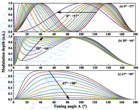 Next, the MDs are also simulated. According to the definition formula Equation (9) of MD, we desire an MD as large as possible, and want to keep the MD as smooth as possible to obtain good filter rejection across the whole tuning range. In order to explore the variation trend of the MD, the results are divided into three regions, which are plotted in Figure 6. (a) (0 to 57), (b) (58 to 66), and (c) (67 to 90), respectively. It is seen that the MDs are always 0 when the tuning angles are 0 and 180. In Figure 6a,b, the MD becomes asymmetrical and its smooth regions become large with the increase of . Meanwhile, the minimum values of the MD increase when the varies from 58 to 66. When the is near 67, the minimum value of MD is up to 1 and the MD curve has no dip after = 67. As shown in Figure 6c, the variations of MDs are smooth and the maximum value of MD starts to decrease when the increases from 67 to 90. Therefore, we can choose the appropriate according to the above conclusions in practice to achieve the desired tuning results.