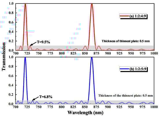 For the selection of thickness ratio, by simulating the transmission curves of BRFs with different thickness ratios, a large number of results also can give several suggestions about searching for optimal thickness ratio. The one is that the FSR and linewidth of the multi-plate BRF were determined by the thickness of the thinnest and the thickest plate, respectively. The other one is that the BRFs had better suppression to side-mode when the thickness of the BRFs had no common divisor with each other. In 1992, Wang and Yao once pointed out that the four-plate BRF designed with a thickness ratio of 1:2:4:9 or 1:2:5:9 had maximum blocking from the side transmission peaks [70]. On this basis, we further simulate and compare the transmission curves of 1:2:4:9 and 1:2:5:9 based on Equation (12), and the results are shown in Figure 8. The side-mode transmissions of these two types of multi-plate BRFs are 9.5% and 6.8%, respectively. Clearly, the multi-plate BRF with the thickness ratio of 1:2:5:9 has a higher rejection ability, which verifies the validity of the above conclusions.