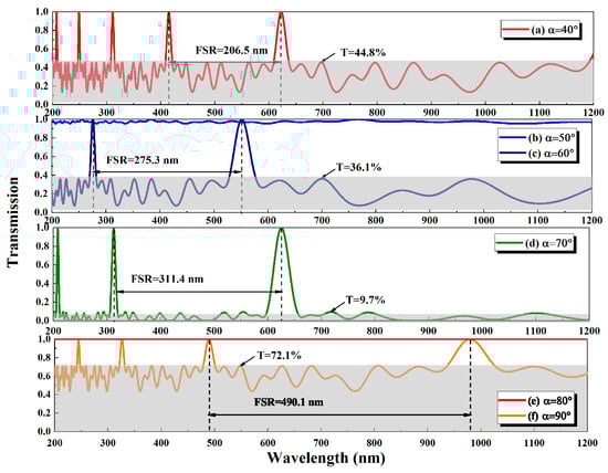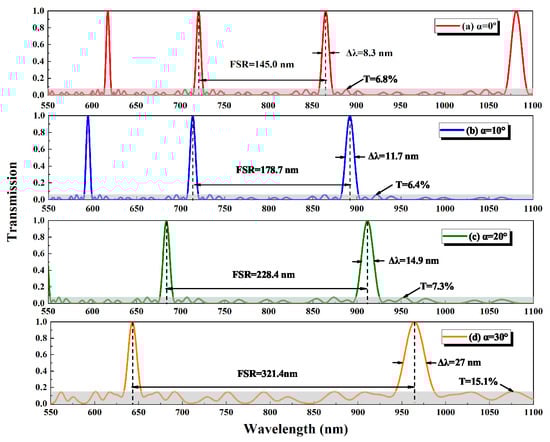 Then, the transmission curves of multi-plate BRF with different diving angles are calculated, and the results are shown in Figure 9 and Figure 10. It is seen that the side-mode transmission are always lower than 15.1% when the is lower than 30, whereas the transmissions of side-mode increase sharply when the is higher than 30, which is too high to provide enough side-mode rejection for laser frequency selection. Therefore, the lower than 30 is a good candidate in practice. Specifically, Figure 9 marks the FSR and linewidth of the multi-plate BRF at different . It is illustrated that with the increase of , the FSR becomes large, which is beneficial to broadband tuning range achievement, whereas linewidth and side-mode transmission become large, which has an adverse effect on side-mode rejection. Therefore, both tuning range and side-mode rejection should be taken into account and given good balance during the BRF design.