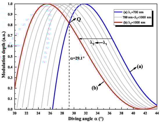 Relationship between modulation depth (MD) and corresponding to different wavelengths (700 nm–1000 nm).