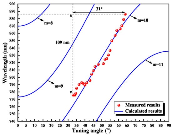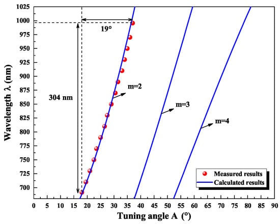 For the Ti:sapphire crystal with the fluorescence spectrum of 700–1000 nm, the relationship between and was simulated and depicted in Figure 11. Clearly, a critical point satisfied the optimal condition in Equation (14), which was termed Q. For point Q, the value of was 29.1, and the value of was closest to the maximum of unity for the wavelength range of 700–1000 nm. Therefore, = 29.1 was determined as the optimal diving angle for the BRF in the wide-band single-frequency continuous-wave tunable Ti:sapphire laser (700–1000 nm). Then, the thinnest plate and thickness ratio of 0.5 mm and 1:2:5:9 were adopted in the experiment to design the broadband tuning element. At last, the tuning curve was measured experimentally by rotating the BRF, which was illustrated along with calculated tuning curves in Figure 12. It was seen that the wavelength of the output laser was successfully tuned from 691 nm to 995 nm (304 nm) with the BRF rotation angle of 19, the corresponding tuning efficiency is 16 nm/. The experimental results were in good agreement with the theoretical analysis results which well demonstrated the reliability of the reported BRF design method.