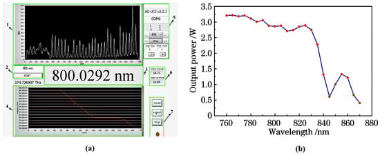 The interface of the designed LabVIEW control program was shown in Figure 15a, which was dived into six regions. The measured real-time wavelength was shown in region 1 and region 3, the region 2 was used for wavelength setting, the region 4 shown the wavelength change curve during the tuning process. In region 5, the user could control the rotating motor manually. The region 6 and region 7 was used for assistant control. At last, the output power of different wavelength was measured by using the designed automatic tuning device, and the result was shown in Figure 15b. It was implied that the laser was successfully and automatically tuned from 760 nm to 870 nm by using a multi-plate BRF with the thickness of 1 mm, 2 mm and 4 mm.