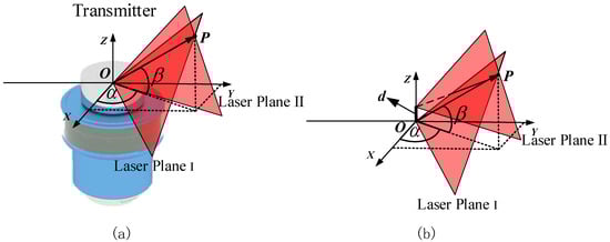 In this expression, represents the normal vector of the first fanned laser, represents the normal vector of the second fanned laser, is the scanning angle of the first fanned laser, is the scanning angle of the second fanned laser, and is the intercept for the second fanned laser on axis Z.