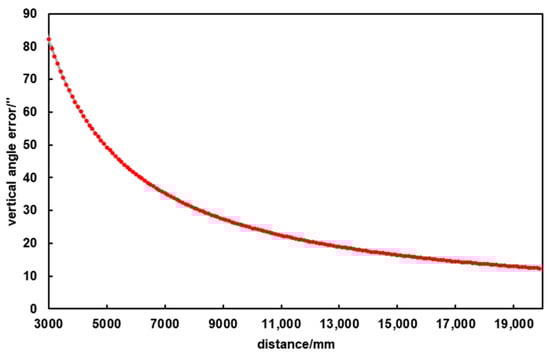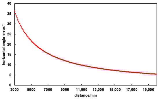 The simulation results are shown in Figure 5 and Figure 6. The horizontal and vertical angle errors introduced by laser devices and shaft assembly errors varied with the distance between the target and transmitter, and the introduced error was significant. The simulation results indicate that the evaluation method based on the horizontal and vertical angles was not accurate. The accuracy of the horizontal and vertical angles changed as the target changed. The farther the target was from the transmitter, the smaller the error became, but there was still an error of more than 10 arc seconds in the main working distance of the transmitter. Thus, it was necessary to select the scanning angle as the evaluation target to reflect the actual performance of the transmitters.