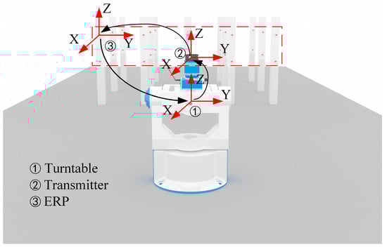 As shown in Figure 7, three Cartesian coordinate systems were defined: the ERP coordinate system , the turntable coordinate system , and the transmitter coordinate system . The rotation and translation matrices from the ERP coordinate system to the transmitter coordinate system were defined as and , respectively. The rotation and translation matrices from the transmitter coordinate system to the turntable coordinate system were defined as and , respectively. Thus, Equation (6) was obtained: