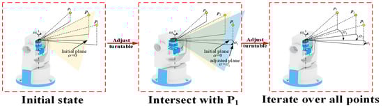 The schematic of turntable adjustment is shown in Figure 8, and the process is illustrated in Figure 9. As shown in Figure 8, the proposed method transformed the angle measurement error into repeatability by choosing a fixed value for the scanning angle. The turntable’s reference angle was obtained when the value of and equaled the preset angle. Because the angular resolution of the turntable was less than 0.5 arc seconds, the and uncertainty for each control point could be reduced to the same level by the mapping relationship. To simplify the expressions, the values of and were set to , and Equation (15) was derived.