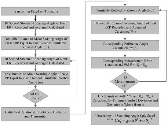 The proposed method involves the following three steps. First, a laser tracker is used to construct the enhanced reference points (ERP). The laser tracker measures the ERP in separate locations, and the measurement results of laser trackers are optimized by, redundantly, Laser Interferometer Measurement []. Second, the transmitter is fixed on a turntable, and we verify the rotational repeatability of the transmitter. An averaging algorithm is applied to further decrease the repeatability error. Third, the turntable is operated to make the transmitter’s observations for each control point the same. The target function is established to calibrate the relationship between the transmitter and the turntable, and the Levenberg–Marquardt algorithm is utilized []. Finally, the evaluation results are derived by comparing the reference and scanning angles.