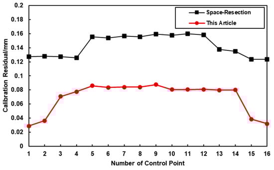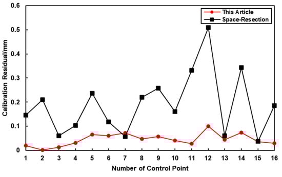 The calibration residual of the method proposed in this article is significantly smaller than that of the traditional space-resection method. The changing trends of both curves were nearly identical, reflecting the influence of the arrangement of control points on the calibration process.