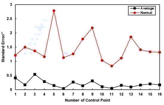 The results are shown in Figure 11. The standard error was approximately 1.45 arc seconds, which did not satisfy the high repeatability requirement of the calibration method. Therefore, we measured 300 times the average value to minimize the repeatability error. The experimental results show that the average uncertainty was approximately 0.2 arc seconds.