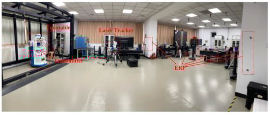 The setup for the calibration of the relationship between the transmitter and turntable is shown in Figure 12. The ERP needed to be constructed first. There were 16 control points, with magnetic nests placed around the space. The volume of the experiment space was 10 × 6 × 3 , and a laser tracker measured the ERP at three different positions. The coordinates of the control points were calculated using a bundle adjustment algorithm [].
