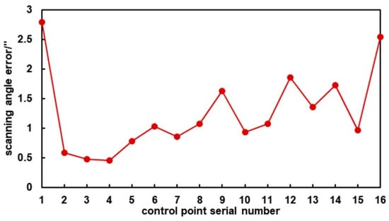 The uncertainty regarding the scanning angle was calculated by assuming that the uncertainty in the first and second scanning angles was equal. According to the uncertainty calculation, Equation (21), the uncertainty of the angle measurement result was approximately 1.7 arc seconds, with k = 1.