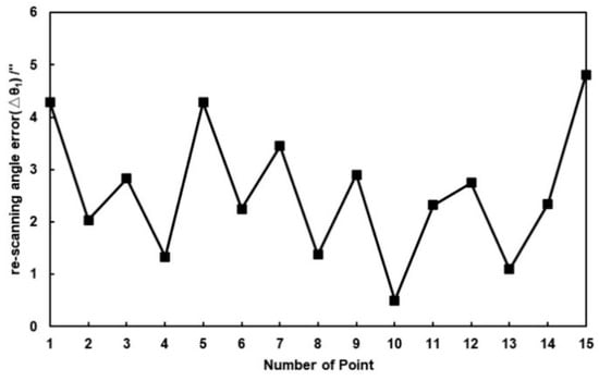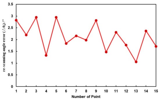 As shown in Figure 17, the average re-scanning error was 2.57 arc seconds, and the standard error was 1.20 arc seconds, which is higher. This result indicates that the horizontal- and vertical-angle-based angle measurement evaluation method is highly influenced by the EPR arrangement due to the fanned lasers and shaft assembly errors.