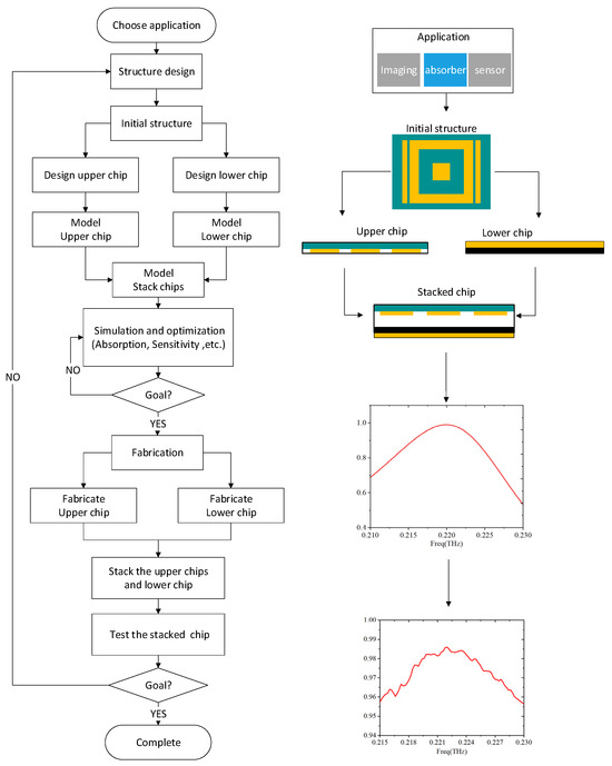 After that, the initial model should be simulated and analyzed based on the application requirements. The structural and dimensional parameters are gradually optimized according to the simulation results. Then, determine whether the design indicators (such as absorption rate, sensitivity, etc.) are met. If the indicators are not met, return to continue modifying and optimizing the relevant parameters. If the indicators are met, proceed to the fifth step of “fabrication”. In this step, semiconductor-based processes (such as coating, lithography, and etching) are typically used to fabricate the upper chip and the lower chip separately. Then, the chips are stacked. The sixth step is to test the performance parameters of the stacked chip using a THz-TDS (terahertz-time domain spectrometer) or high-frequency vector network analyzer. If the test results do not meet the design specifications, it is necessary to redesign and optimize the structure, re-model and simulate, repeat the optimization steps, and reprocess the test chip until the design specifications are met. The left side in Figure 2 is a flow chart of the entire design process, and the right side in Figure 2 is a schematic diagram of the key design process.
