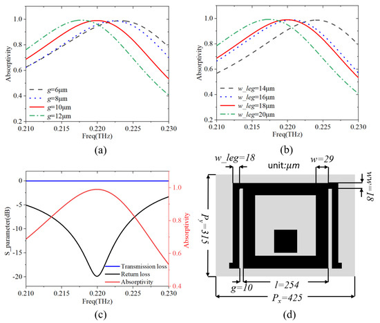 Figure 6a depicts the influence of the gap g between the resonant square ring and the resonant arm on the absorption frequency of the metamaterial absorption chip. It can be seen from the simulation results that when the gap increases from 6 μm to 12 μm, the absorption frequency of the stacked metamaterial absorption chip moves from 0.218 THz to 0.224 THz. Figure 6b shows the effect of the resonant arm width w_leg on the absorption frequency of the metamaterial absorption chip, where the absorption frequency of the metamaterial absorption chip moves from 0.225 THz to 0.216 THz when the width increases from 14 μm to 20 μm. Finally, we selected the desired 0.220 THz as the optimal absorption frequency point, and the S parameters and absorption curve obtained after parameter optimization are shown in Figure 6c. The absorptivity exceeds 99% at 0.22 THz and exceeds 80% at 0.21–0.23 THz. The specific dimensions of the optimized structural unit are shown in Figure 6d. It could be concluded from the simulation results that the THz metamaterial absorber designed based on the stacked chip scheme has nearly 100% absorption performance when the thickness of upper chip is less than 1/800 of the wavelength.