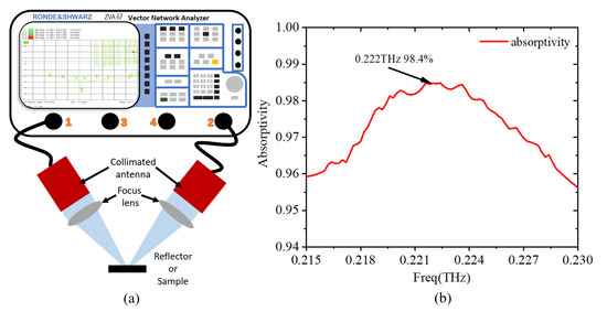 In order to accurately measure the S parameter, two steps are needed. The first step is to measure an object with near 100% reflectivity (gold plane reflector) as calibration to obtain the S-parameter Sca. The second step is to keep the test system unchanged, replace the gold reflector with the metamaterial chip as a sample for data measurement, and obtain Ssa. Considering the loss of the environment (e.g., air), the two S parameters need to subtract, and the final S parameter is S = Ssa − Sca. Finally, the absorption spectrum can be calculated by Formula 2, and the obtained actual absorption spectrum of the metamaterial chip is shown in Figure 10b.