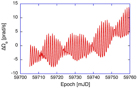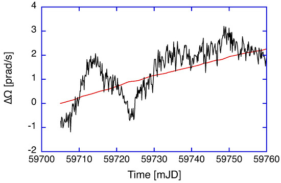 Over the entire length of the observation, we obtain corrections at a level of less than 0.1 ppm, again about one order of magnitude smaller than the null shift correction. For the application of high-resolution inertial monitoring of instantaneous Earth rotation, this contribution matters and cannot be neglected. Figure 6 presents the residuals of the ring laser observation of G over the same two months as shown in Figure 1, with the geophysical models for diurnal polar motion, Chandler and Annual wobble, solid-Earth tides and the variation in length of day applied after the ring laser beat frequency had already been corrected for instrumental effects, namely backscatter coupling and null shift.
