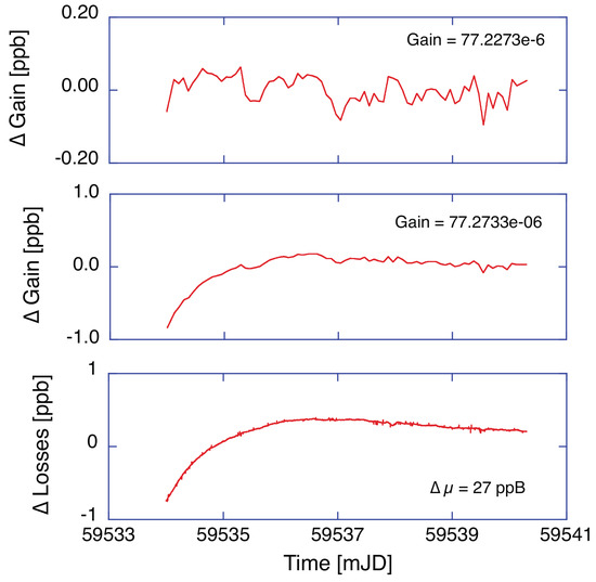 The variation in gain for the controlled beam (top), for the uncontrolled beam (middle) and the difference in losses (bottom).