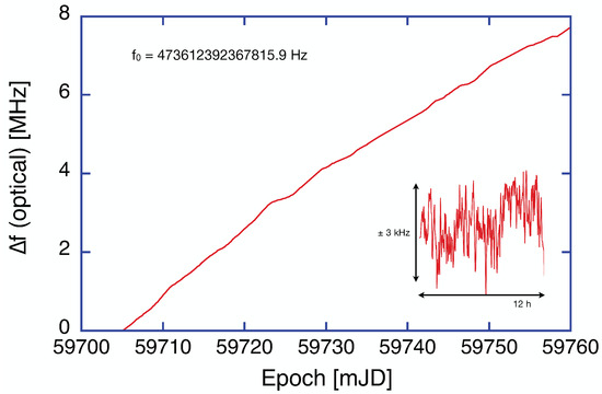One can see that the optical frequency is very stable. It drifts upwards slowly by 8 MHz over 55 days. The instability of the optical cavity has a standard deviation of 1.2 kHz over an averaging time of 1 min, which is illustrated in the inset of Figure 4. The observed drift is the expected response to the annual cycle of the ambient temperature in the ring laser laboratory, which dropped very smoothly by over the entire duration of the measurement. The large mass of the Zerodur block smoothes this trend even further. A shrinking perimeter increases the optical frequency, which is consistent with the observation.