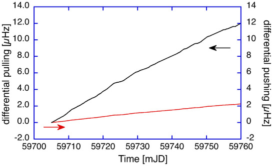 Display of the calculated corrections for the differential pulling and pushing terms. The obtained corrections are below 0.1 ppm and therefore relevant for high-resolution Earth rotation sensing. Notice the difference in scale between the two contributors.